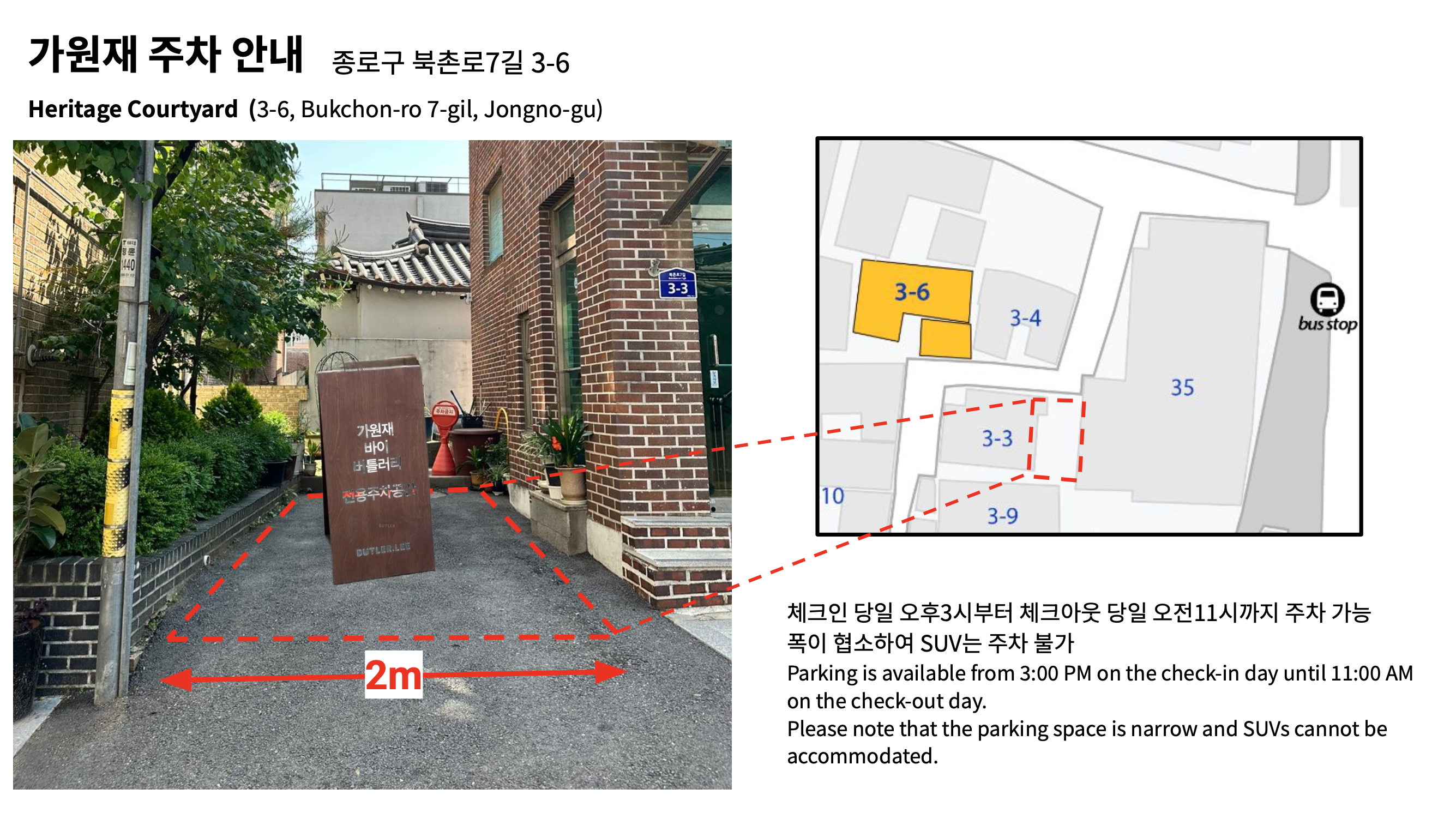 • 주차: 지정된 구역에 1대 가능합니다. (폭이 좁아 SUV 이상은 불가)