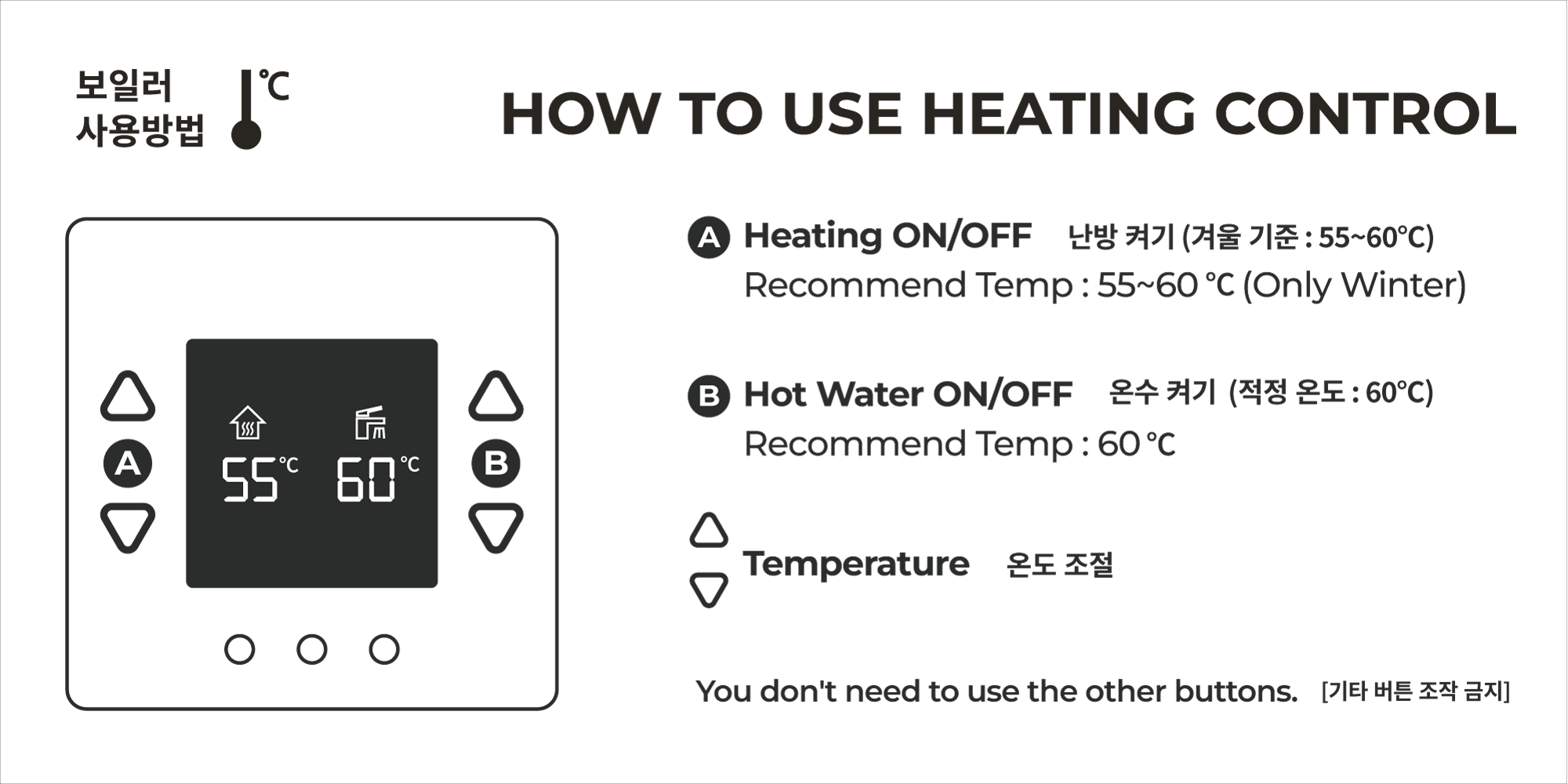 • '온돌' 버튼을 누르고, 온도를 조절해 주세요 (겨울 적정온도는 55~60℃입니다)