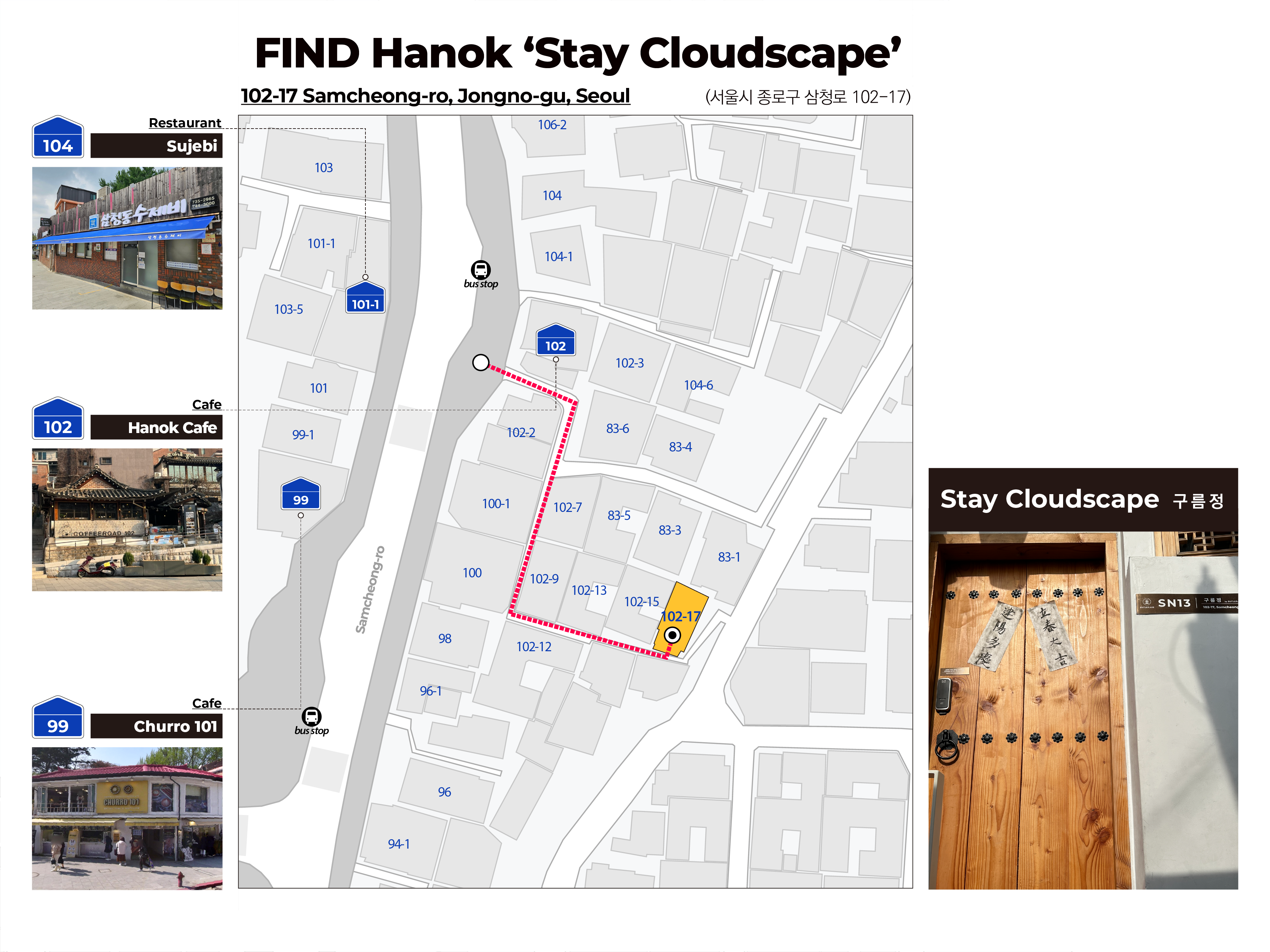골목길이 좁아서 차량 진입이 불가합니다. 택시 혹은 차량을 이용하시는 경우, 황남주택 삼청점 (삼청로 102) 에서 하차하신 후 도보로 이동하세요.