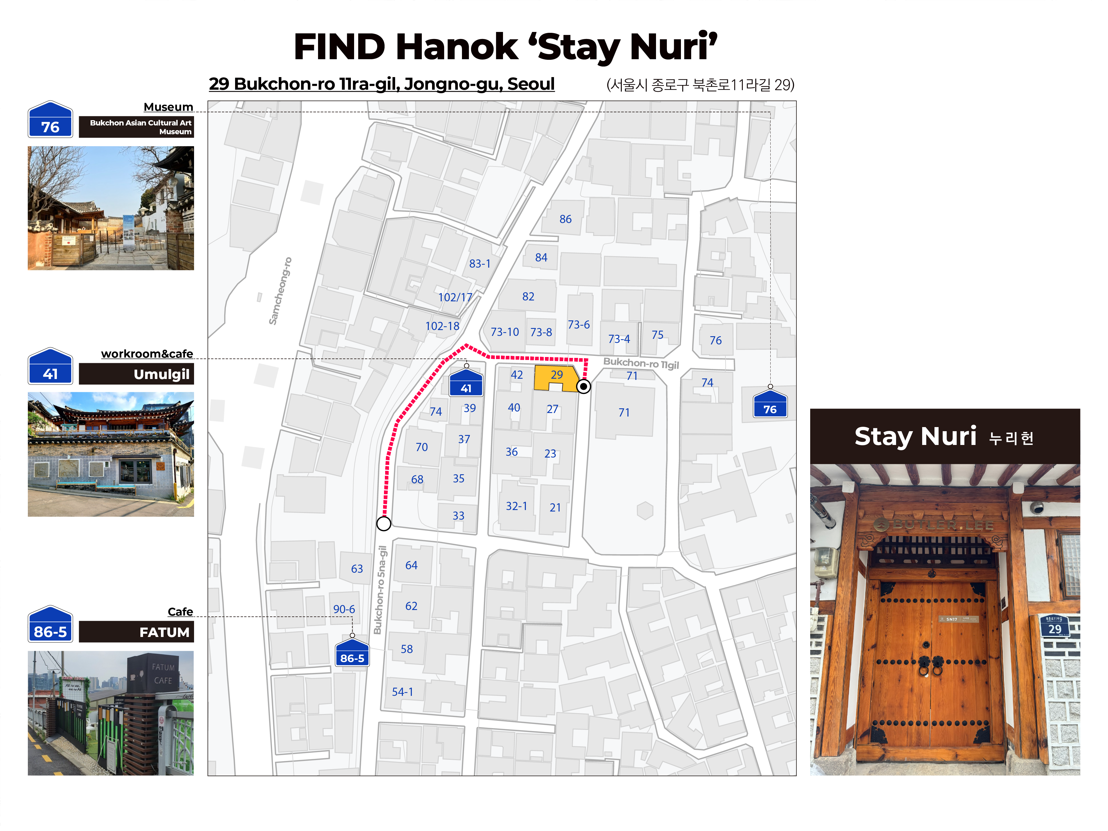골목길이 좁아서 차량 진입이 불가합니다. 택시 혹은 차량을 이용하시는 경우, 우물길정원 ( 종로구 북촌로11다길 41) 에서 하차하신 후 도보로 이동하세요.