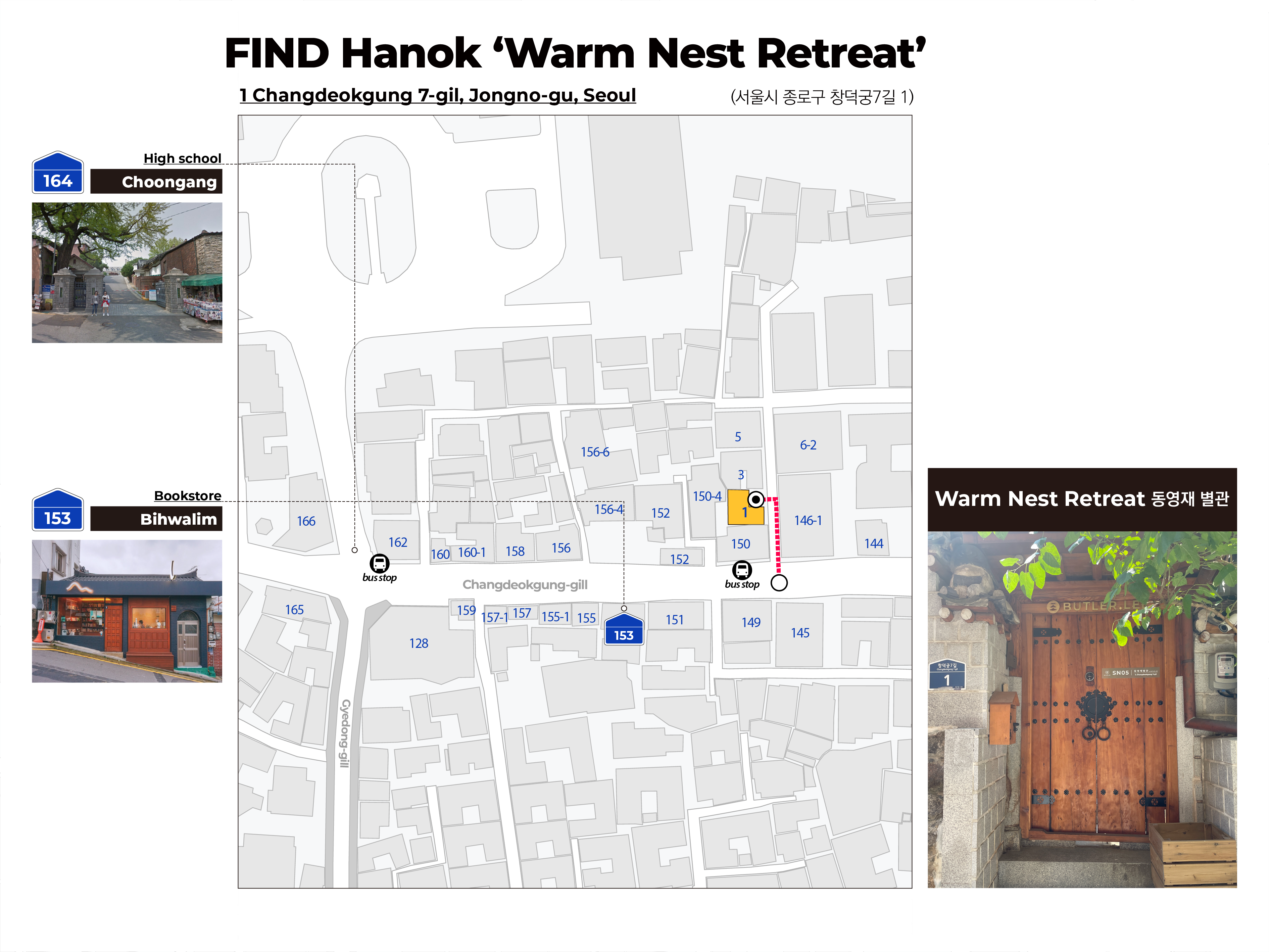 택시 혹은 차량을 이용하시는 경우, 비화림 (서울 종로구 창덕궁길 153 1층) 에서 하차하신 후 도보로 이동하세요.