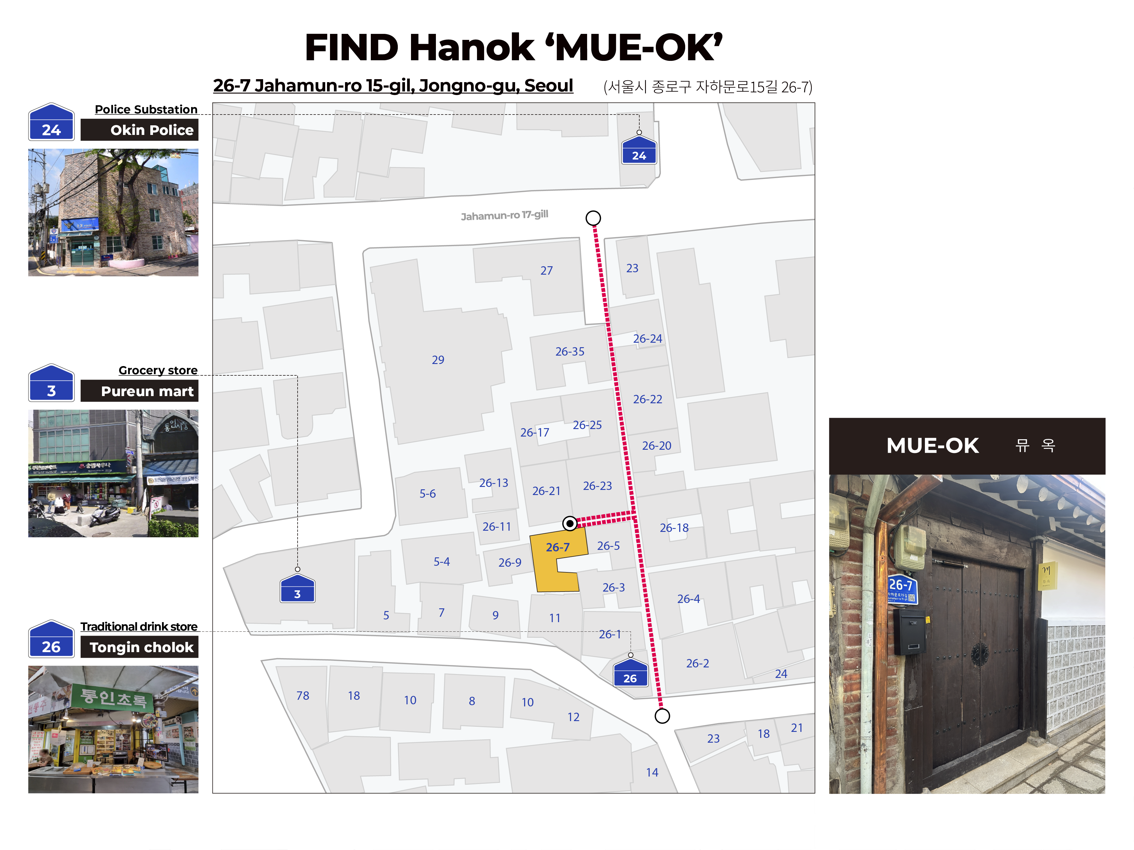 골목길이 좁아서 차량 진입이 불가합니다. 택시 혹은 차량을 이용하시는 경우, 옥인파출소 (종로구 자하문로17길 24) 에서 하차하신 후 도보로 이동하세요.