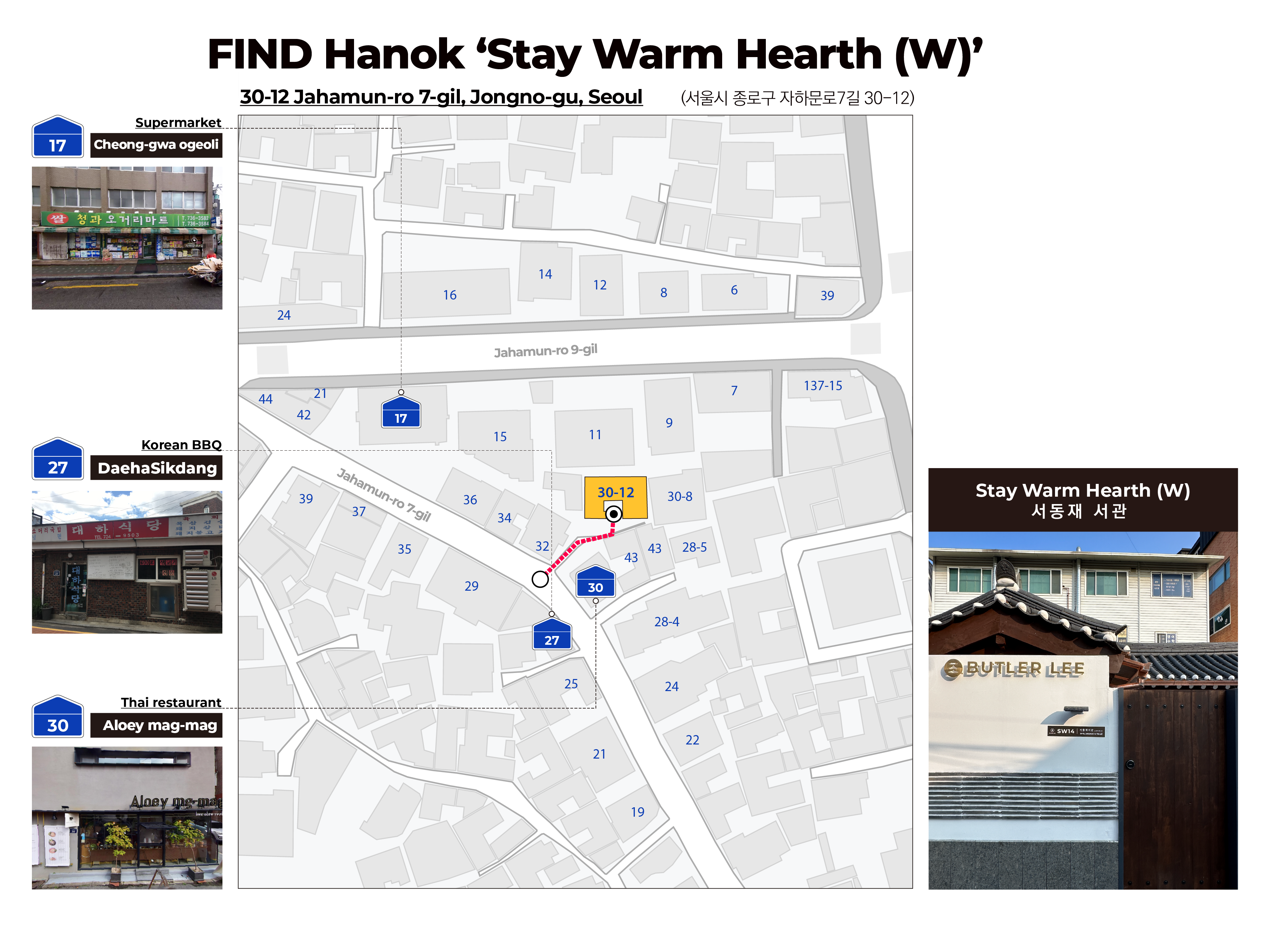 택시 혹은 차량을 이용하시는 경우, 알로이 막막(서울 종로구 자하문로7길 30) 에서 하차하신 후 도보로 이동하세요.