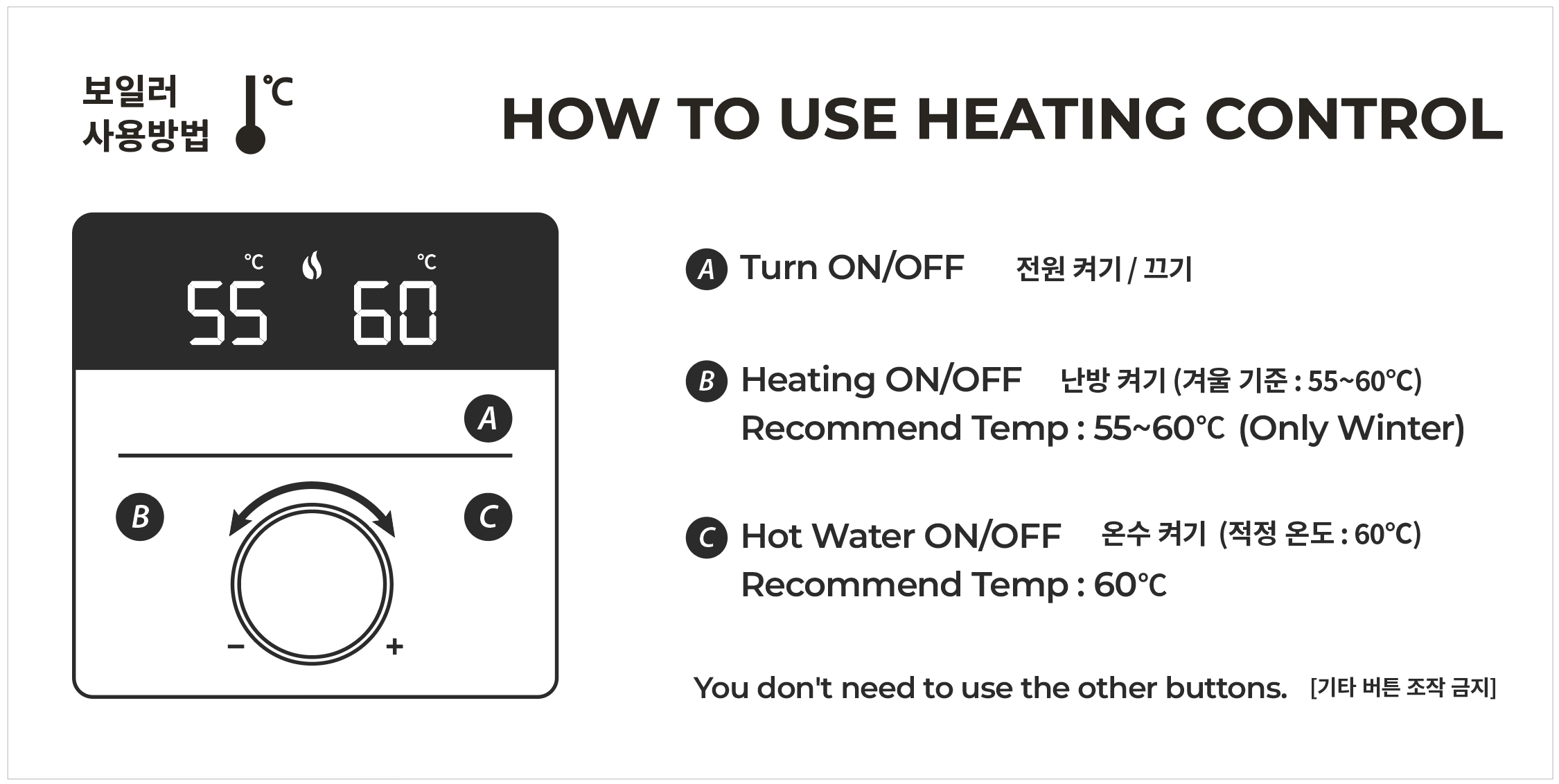 '온돌' 버튼을 누르고, 온도를 조절해 주세요 (겨울 적정온도는 55~60℃입니다)