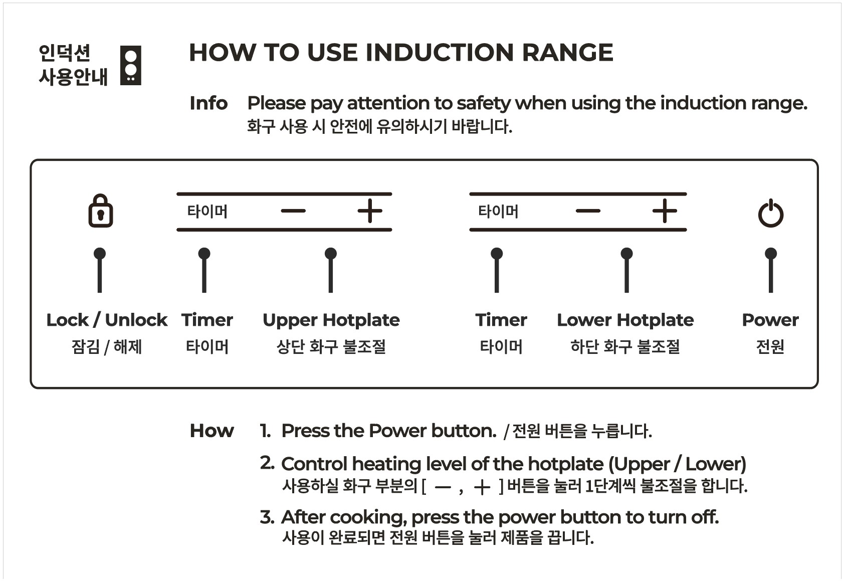조리기구를 올려둔 후, 전원을 켜고 화력을 조정하세요.