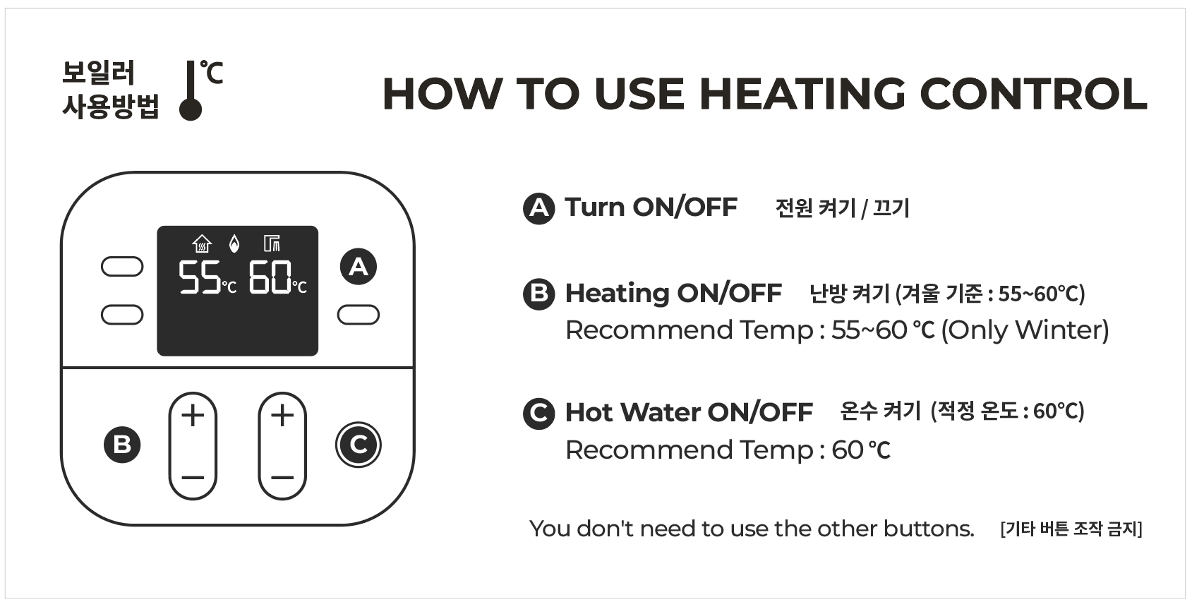 '온돌' 버튼을 누르고, 온도를 조절해 주세요 (겨울 적정온도는 55~60℃입니다)