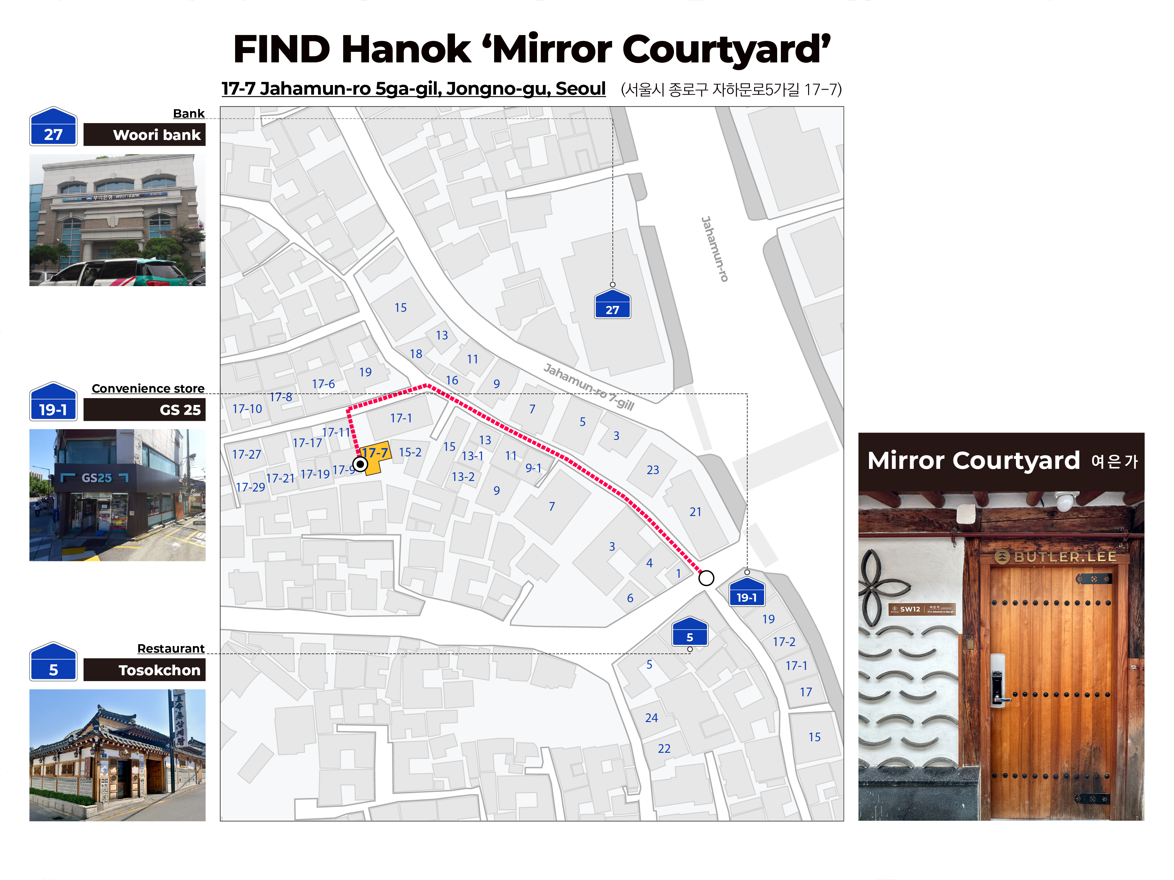 택시 혹은 차량을 이용하시는 경우, 우리은행 효자동지점 (자하문로 27) 에서 하차하신 후 도보로 이동하세요.