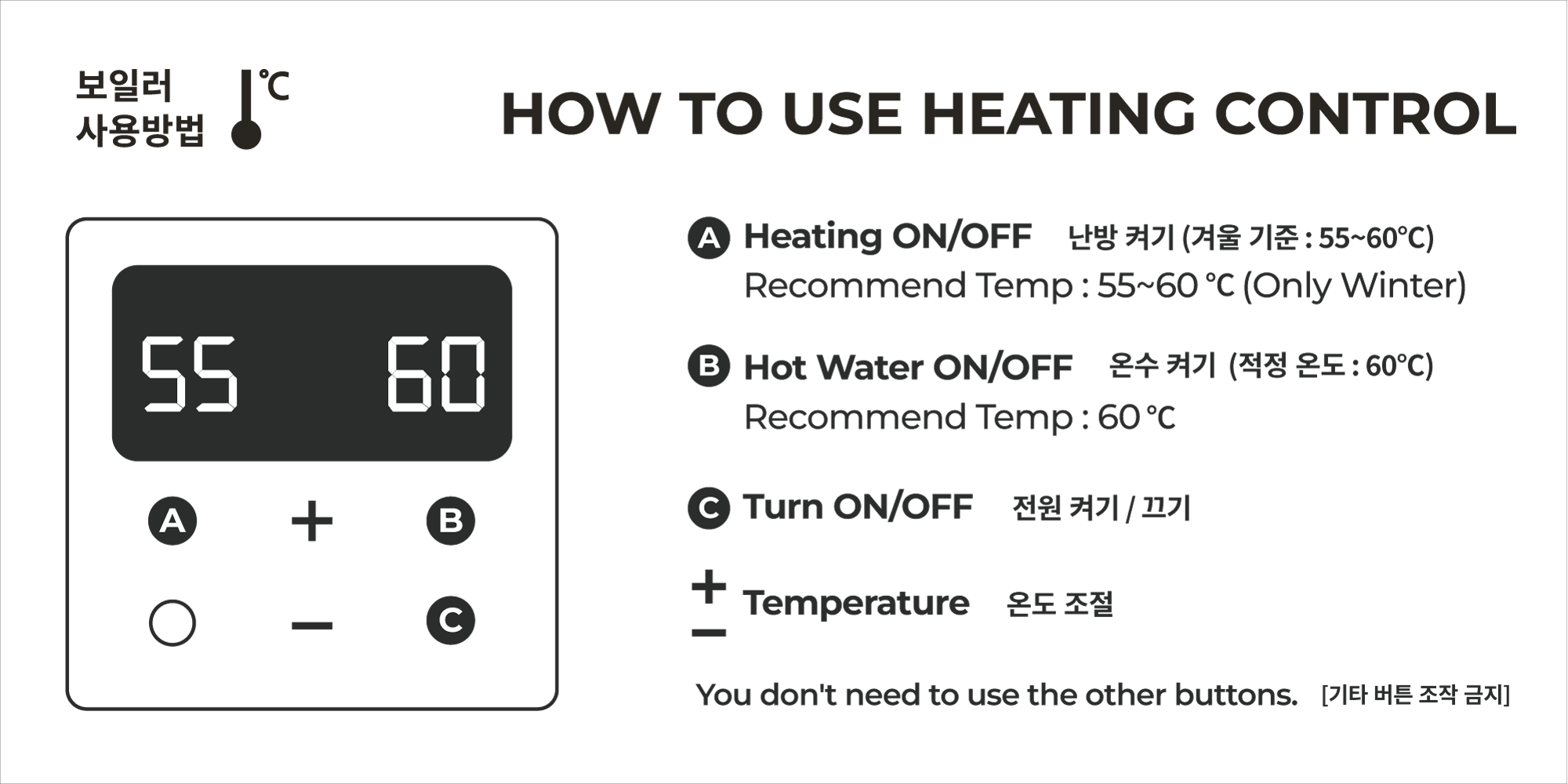'온돌' 버튼을 누르고, 온도를 조절해 주세요 (겨울 적정온도는 55~60℃입니다)