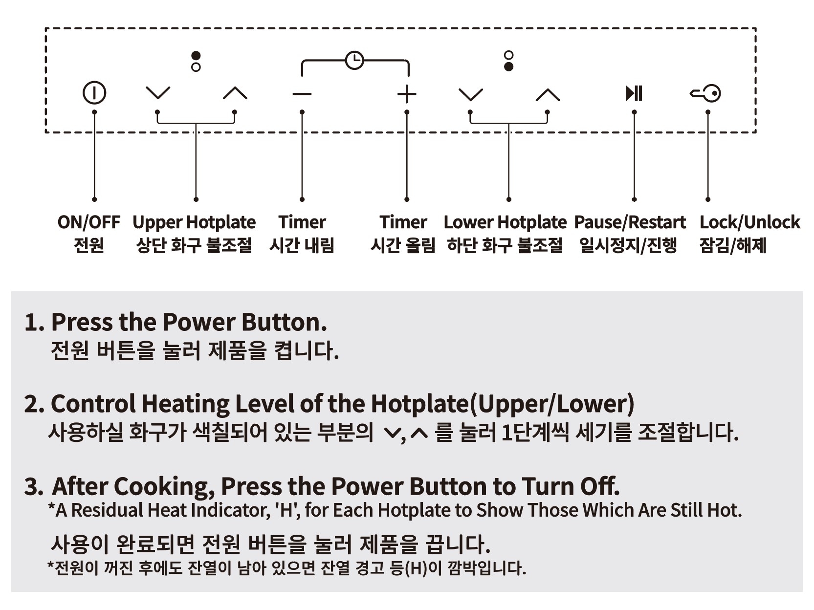 조리기구를 올려둔 후, 전원을 켜고 화력을 조정하세요.