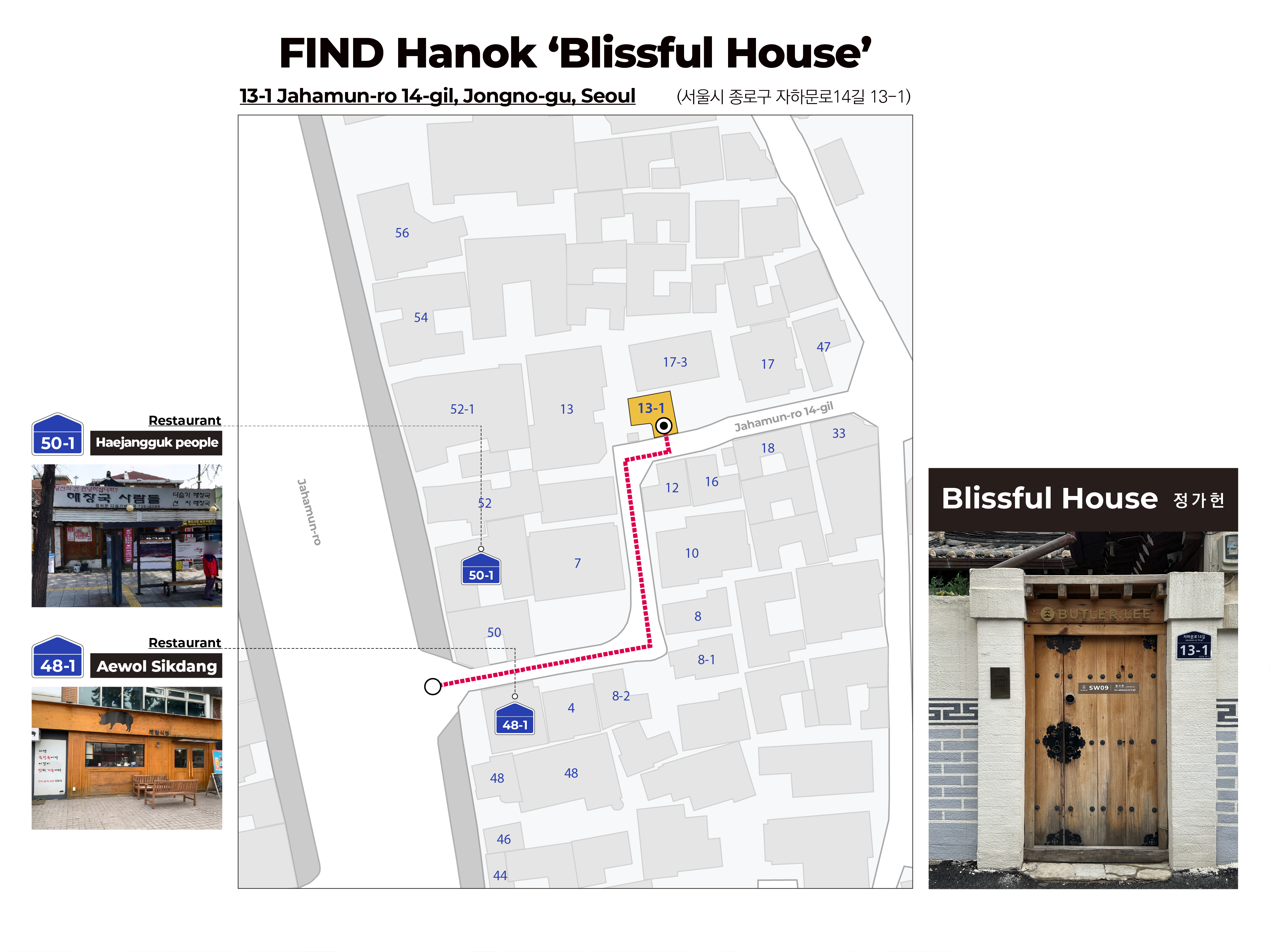택시 혹은 차량을 이용하시는 경우, 애월식당(종로구 자하문로 48-1) 에서 하차하신 후 도보로 이동하세요.