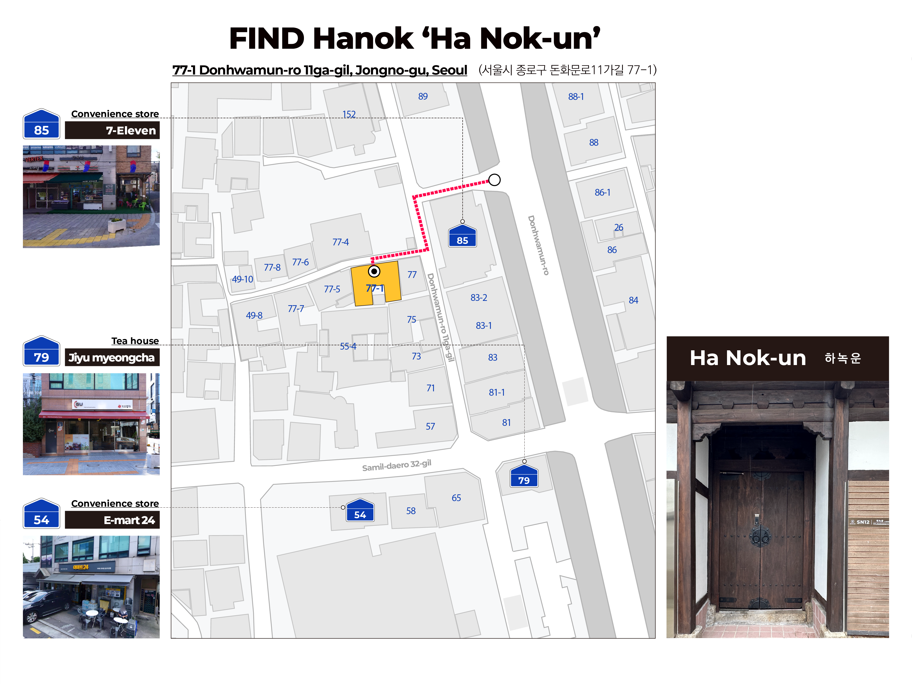 골목길이 좁아서 차량 진입이 불가합니다. 택시 혹은 차량을 이용하시는 경우, 세븐일레븐