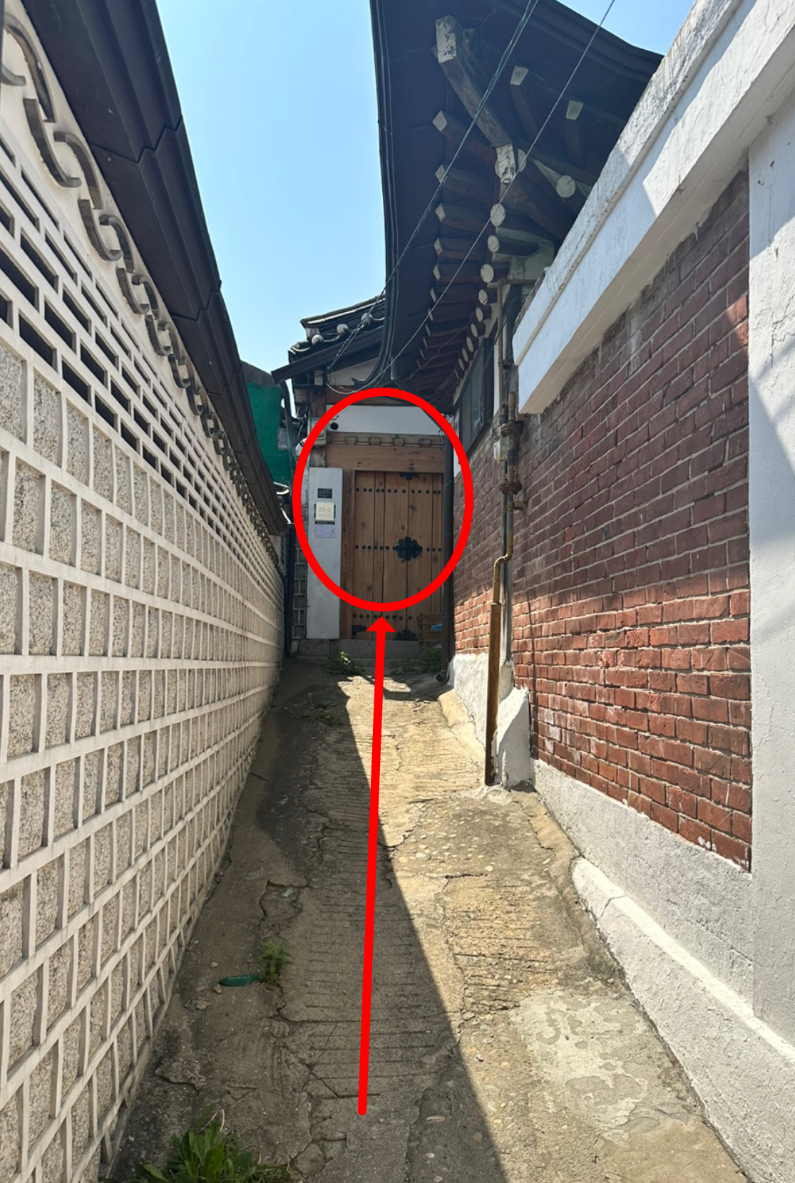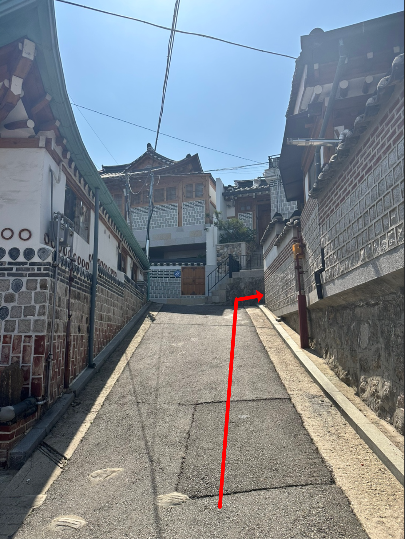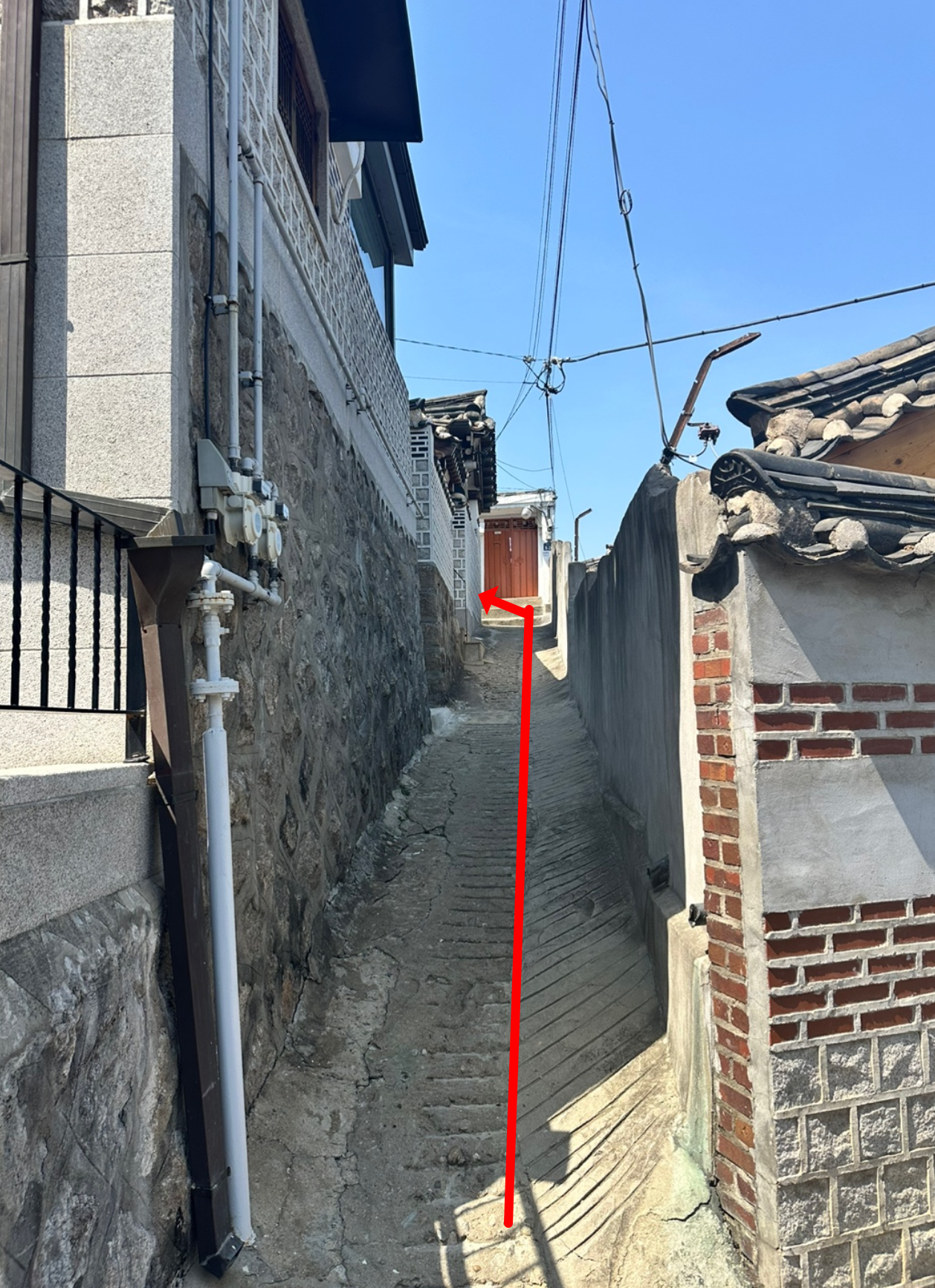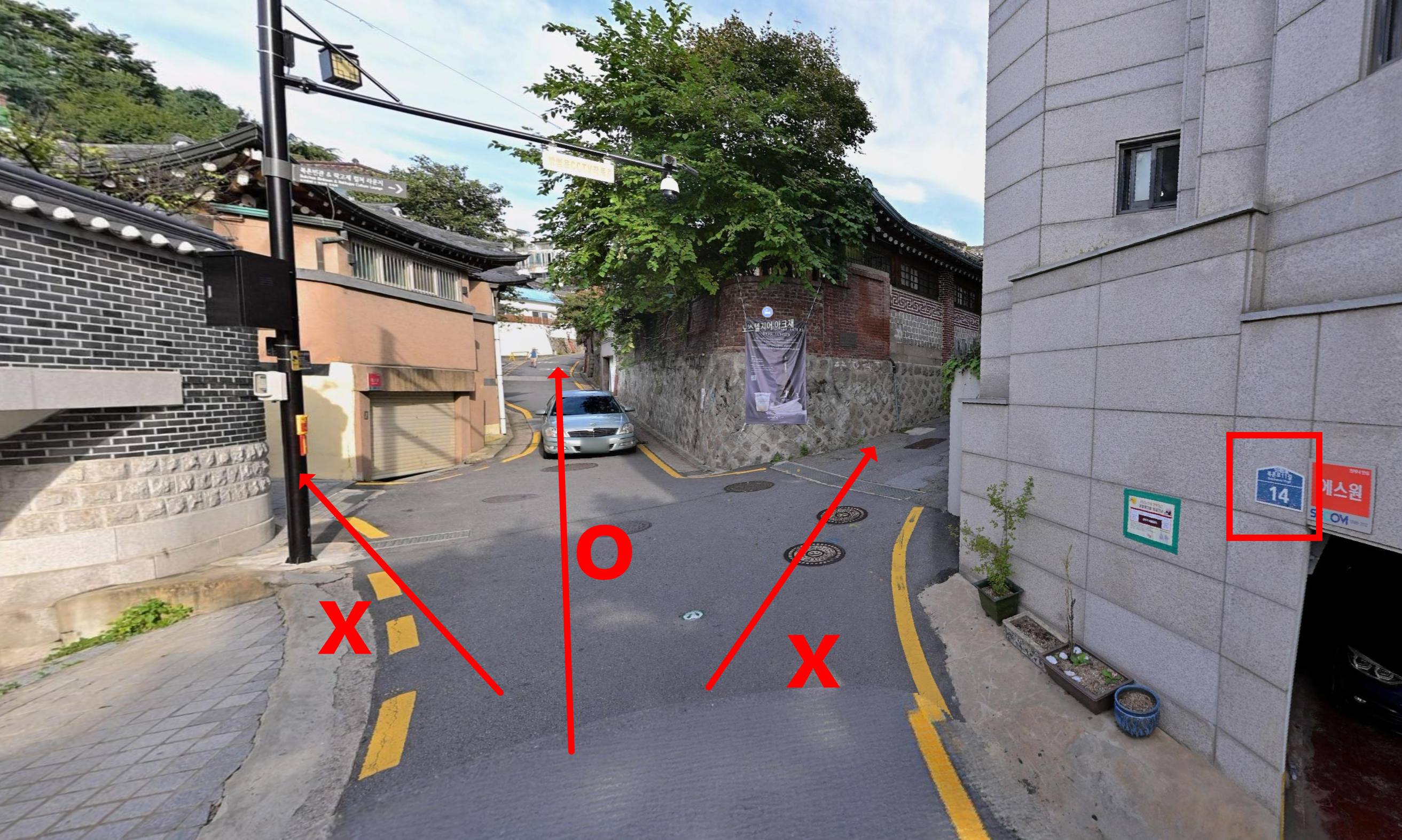 언덕 끝에서 좌회전 후, 오른쪽 좁은 골목으로 진입